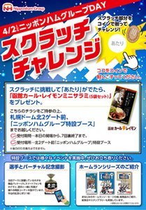 ご来場の方に入口ゲートにてお配りするチラシについているスクラッチに挑戦して「あたり」が出たら、「函館カール・レイモンミニサラミ(5袋セット)」をプレゼント。「あたり」のチラシをご持参の上、北2ゲート前「ニッポンハムグループ特設ブース」までお越しください。