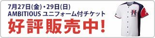 7月28日(土)オリックス・バファローズ戦のチケットは、ご好評につき残りわずかとなりました。つきましては、7月25日(水)より3F立見入場券を追加販売いたします。当日はご来場者全員に「AMBITIOUS ユニフォーム」をプレゼントいたします!お見逃しなく!