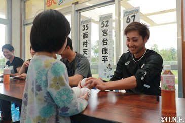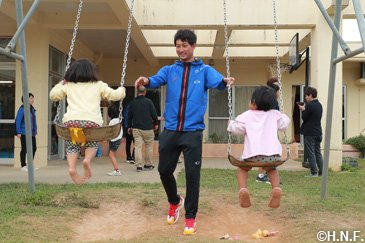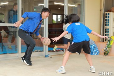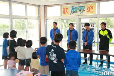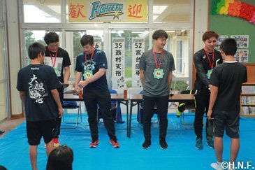 北海道日本ハムファイターズの宮台康平投手、西村天裕投手、岸里亮佑選手、淺間大基選手の4選手が2月18日(月)、1軍キャンプ地、名護市の「児童養護施設なごみ」を訪問しました。オフを利用して児童30人と約1時間、交流。キャッチボールやバスケットボール、卓球などを一緒に楽しみました。サイン会も行われ、笑顔のこどもたち。お返しに背番号入りの手作り金メダルがプレゼントされました。淺間選手は「みんな元気で僕たちも元気をもらいました。鬼ごっこでは負けないよう本気で逃げました」と汗ばんだ様子で、児童との交流を振り返りました。子どもたちからもらった元気を力に変え、キャンプ終盤を駆け抜けます。