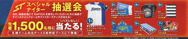 球場内北ゲート2前の札幌市交通局特設ブースにおきまして、選手直筆サイン入りレプリカユニフォームをはじめ、各種ファイターズグッズが合計1,500名様に当たる「札幌市交通局スペシャルナイター2019抽選会」を開催いたします!試合当日、SAPICA(サピカ)を提示していただいた方が抽選会にご参加いただけます。ふるってご参加ください。