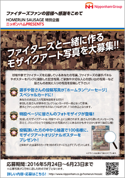 『ファイターズと共に完成させるモザイクアート』をホームランソーセージ特別企画として実施いたします。選手ポスターなどと一緒に撮影して、モザイクアート企画に画像を投稿しよう!!