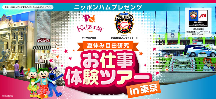 JTB北海道はこの夏、北海道日本ハムファイターズとキッザニアの協力のもと、こども向け職業体験テーマパークとして人気のキッザニアでのお仕事体験と、鎌ケ谷ファイターズスタジアムでのプロ野球のお仕事体験がセットになった〈ニッポンハムプレゼンツ夏休み自由研究 お仕事体験ツアー〉を催行いたします。