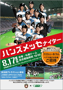 東急ハンズ札幌店とハンズビー札幌ステラプレイス店では、7月23日(土)から8月7日(日)の間、税込3,000円以上お買い上げのお客様を対象に、8月17日(水)に札幌ドームで開催される北海道日本ハムファイターズ対オリックス・バファローズ戦、〈ハンズメッセナイター〉のペア観戦チケットを抽選でプレゼントするキャンペーンを実施しております。詳しくは店頭ポスターやホームページをご確認ください。