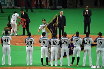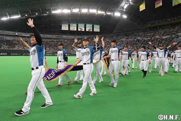 北海道日本ハムファイターズは9月28日(水)、埼玉西武ライオンズに勝利し、4年ぶり7度目(前身の東映フライヤーズ、日本ハムファイターズを含む)のリーグ優勝を果たしました。9月30日(金)の対千葉ロッテマリーンズ戦の試合前に、優勝ペナント・優勝旗・優勝トロフィーの授与式が執り行われることとなりました。試合後の最終戦セレモニーに於いては、ペナント・優勝旗を持ってファイターズナインが場内1周、ファンの皆様と喜びを分かち合います。