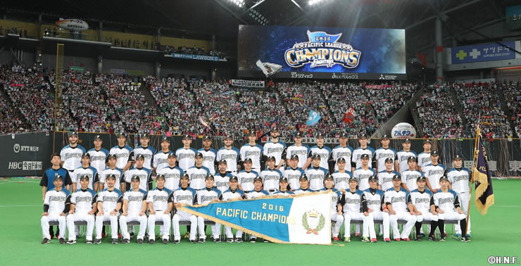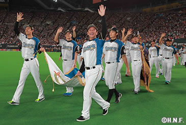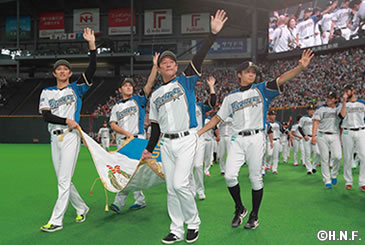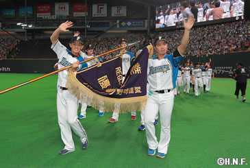 その後はペナントを広げて持つ栗山監督や増井浩俊投手、中島卓也選手らを先頭に場内一周。西武プリンスドームでの優勝決定から2日、本拠地のスタンドを埋め尽くしたファンの皆様に手を振り、降り注ぐ拍手や歓声に応えて覇権を奪還した喜び、充実感をかみしめていました。