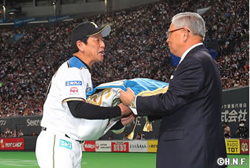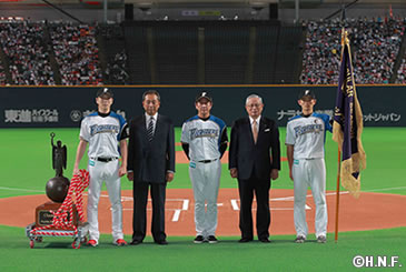 4年ぶり7度目のパシフィック・リーグ制覇を果たした北海道日本ハムファイターズは9月30日(金)、千葉ロッテマリーンズ25回戦(札幌ドーム)の試合前にペナント授与式を実施しました。日本プロフェッショナル野球組織の熊崎勝彦コミッショナーから栗山英樹監督にペナントが、大野奨太選手会長に優勝旗、宮西尚生投手にトロフィーが授与され、142試合目で激闘を制した感動をファンの皆様と分かち合いました。