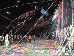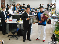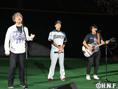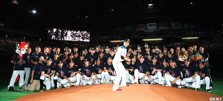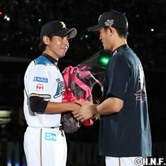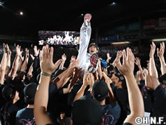 セレモニーでは、バッテリーを組んだ中嶋聡GM特別補佐、高橋信二バッテリーコーチ兼打撃コーチ補佐、大野選手会長、投手陣からは増井、宮西両投手、「W武田」と呼ばれチームを支えた武田久投手が花束を贈呈しました。さらに登場曲として使い続けた「1/6の夢旅人2002」を歌う樋口了一さんが熊本市から駆けつけてくださり、場内を一周する武田勝投手にはなむけの熱唱。優勝当日、ナインの手で3回宙を舞った左腕は、背番号と年齢の38にかけて今度は8回胴上げされ、笑顔でマウンドに別れを告げました。