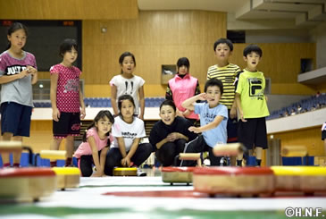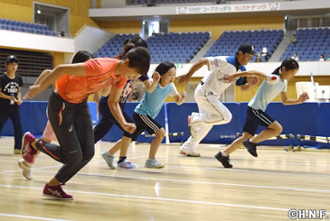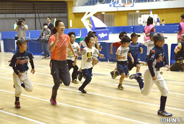 複数のプロスポーツチームが本拠地を置き、冬季種目も活発に行われている地域は世界でも北米とヨーロッパ、そしてここ北海道と言われています。年間を通じて様々なスポーツに触れ合える地域の特性を生かし、課題とされる子供の体力向上を図りたいと、稲葉SCOが旗振り役となり1998年長野五輪金メダルの原田雅彦氏(雪印メグミルク)らに呼びかけて実現したものです。陸上は8月のリオデジャネイロ五輪短距離代表の福島千里選手(北海道ハイテクAC)が「最初の5歩は床を見るようにして、視線の先にひざを持ってくるイメージ」と速く走るコツを伝授。ジャンプは2014年のソチ五輪でラージヒル団体銅メダルを獲得した清水礼留飛選手(雪印メグミルク)が体を支えて空中フォームを教えていき、カーリングも五輪出場経験のある松沢美香氏と石崎琴美氏が体育館でできる「フロアカーリング」を使ってルールを分かりやすく説明していました。