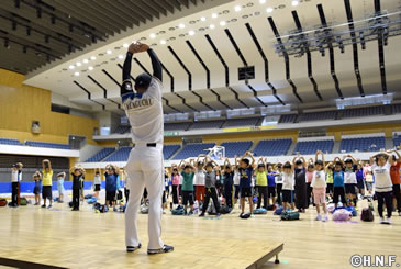 各プロチームはアカデミー講師陣がミニゲームなどを交えて未経験の子供にも興味を引く指導法を実践。栄養学講座では、ファイターズ管理栄養士の柄澤紀氏が大谷翔平投手らの食事メニューを写真で紹介しながら観覧する保護者にも向けて朝食をバランスよく食べる大切さを伝えていました。