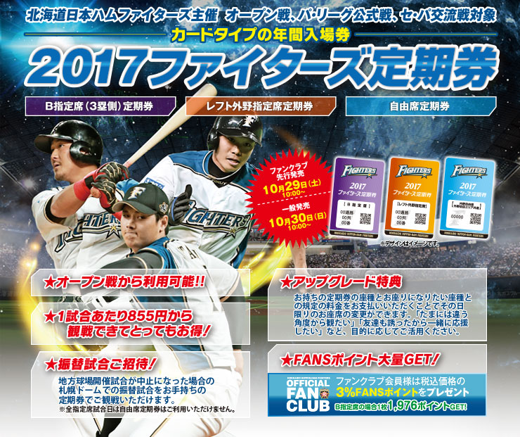 北海道日本ハムファイターズでは、10月30日(日)10:00[ファンクラブ会員先行は10月29日(土)10:00]より、2017ファイターズ定期券の販売を開始いたします!