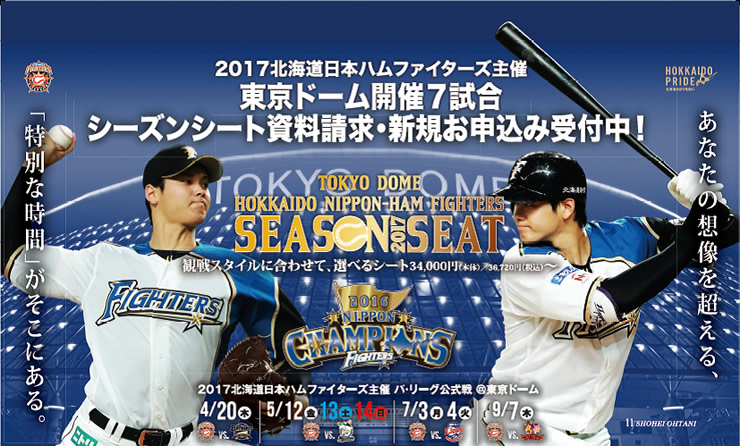 北海道日本ハムファイターズは、2017年シーズンにおける東京ドームでのパ・リーグ公式戦、主催全7試合をご観戦いただける「2017年東京ドームシーズンシート(年間指定席)」の概要が決定し、お申込み受付を開始いたします。「2017年東京ドームシーズンシート」は、2016年より席種などを大幅にリニューアルし、プレミアムな特典も多数ご用意いたしました。様々なシーンでご活用いただき、東京ドームでのファイターズ選手の熱い戦いをあなただけの専用シートでお楽しみください。
