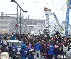 パレードは栗山駅前からスタート。駅前通り約500メートルを30分かけて移動しました。「北海道らしく雪が降り、ファイターズのパレードにはなかった紙吹雪が舞ってほしい」。両方の希望がかなったこともあって満足げな表情。「距離が近くて声がしっかり聞こえた。本当にありがたかった」と感慨深げに話しました。祝福ムードに包まれた4年ぶりのパレードを、指揮官も心から楽しんでいた様子でした。