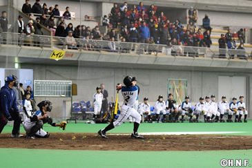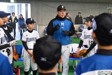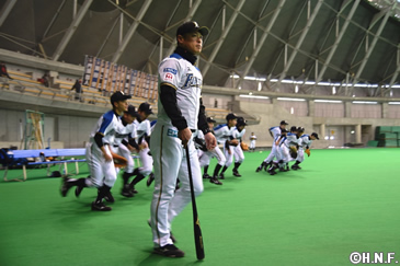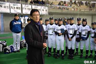 この日は昨年の大会に出場した1学年上のチームと壮行試合が行われ、栗山監督はネット裏から熱いまなざしを注いでいました。第1試合は守備の乱れなどから6点を奪われながら、最終回に集中打で3点を返し、第2試合は三塁への盗塁が送球ミスを誘って本塁を陥れ、引き分けに持ち込む粘り強さを見せました。2005年に始まったこの大会でファイターズジュニアチームは2011年に優勝、2008年と2014年には準優勝に輝いています。チームを率いる高口隆行監督は「戦力的には十分、普段通りの力を出せれば優勝できる自信はあります」ときっぱり。12月27日(火)から広島東洋カープジュニアチーム、福岡ソフトバンクホークスジュニアチームとの予選グループに臨みます。