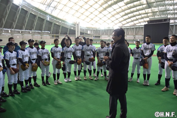 北海道日本ハムファイターズの栗山英樹監督が12月24日(土)、札幌・東区のつどーむを訪れ、「NPB12球団ジュニアトーナメント2016 supported by 日能研」[12月27日(火)~29日(木)、宮崎市]に出場する北海道日本ハムファイターズジュニアチームを激励しました。約900人の応募から難関を突破した18選手を前にして、栗山監督は「ファイターズは今年皆さんのおかげで日本一になれました。その流れをしっかりくんで、いい2016年の締めくくりをしてください。やるからには優勝してほしいと思っています」とメッセージを送りました。