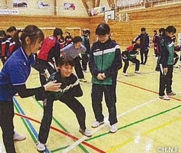 2020年2月21日(金)に、足寄中学校体育館にてファイターズアカデミーによるトレーニング教室が開催されました。ファイターズベースボールアカデミーの立石尚行コーチは、ファイターズの選手たちが実際に行っているスクワットの方法などを説明し、ファイターズダンスアカデミーの田村優佳インストラクターは、「体の軸」をテーマにストレッチ法などを紹介しました。野球やサッカー、バレーボールのスポーツ系の部員のほか、吹奏楽部の部員など合計約100人の中学生は、プロ野球選手も実践しているトレーニング方法を学びました。