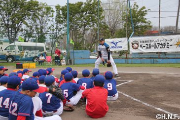 羽幌町は、2018年5月23日(水)に、羽幌町南町運動広場にて、羽幌町野球少年団26名と羽幌中学校野球部12名を対象に、野球教室を開催しました。途中から小雨が降る中、ボールの握り方から、ポジション別練習、実践形式でのバッティング練習等を行い、参加児童及び生徒は熱心にファイターズベースボールアカデミーの牧谷宇佐美コーチと杉山俊介コーチの指導を聞いていました。