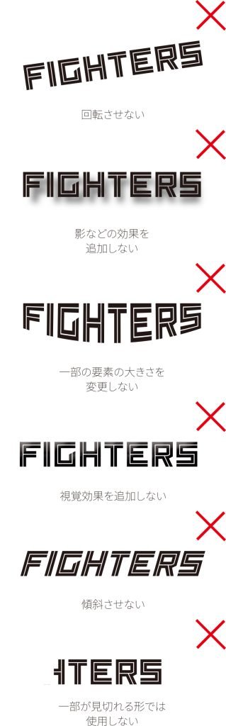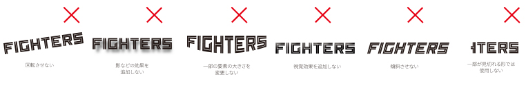 ファイターズブランドを文字によって象徴したマークです。ユニフォームをはじめ、オフィシャルグッズや各種媒体などで使用されます。シンボルマークと組み合わせて使用する場合は、オルタネートマークの規定に準拠してください。ワードマークのフォントを他の単語や文章に転用することは認められません。