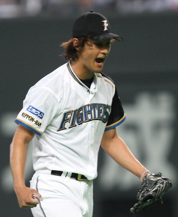 4回、三者連続三振に打ち取り、雄たけびをあげるダルビッシュ投手