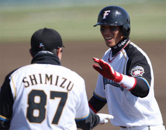 ヒットに清水コーチと笑顔でタッチする陽選手