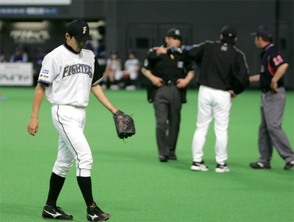 8番 平田 死球 すっぽ抜けたボールがD平田選手の頭部に当たり、多田野投手は危険球退場となりました。 |