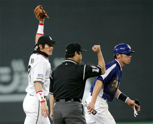 7番 デ ラ ロサ 遊ゴ失 セカンド田中賢がショート陽のこぼした打球を捕球し、3塁へ送球 2塁ランナー和田、オーバーランでベースから飛び出しタッチアウト |