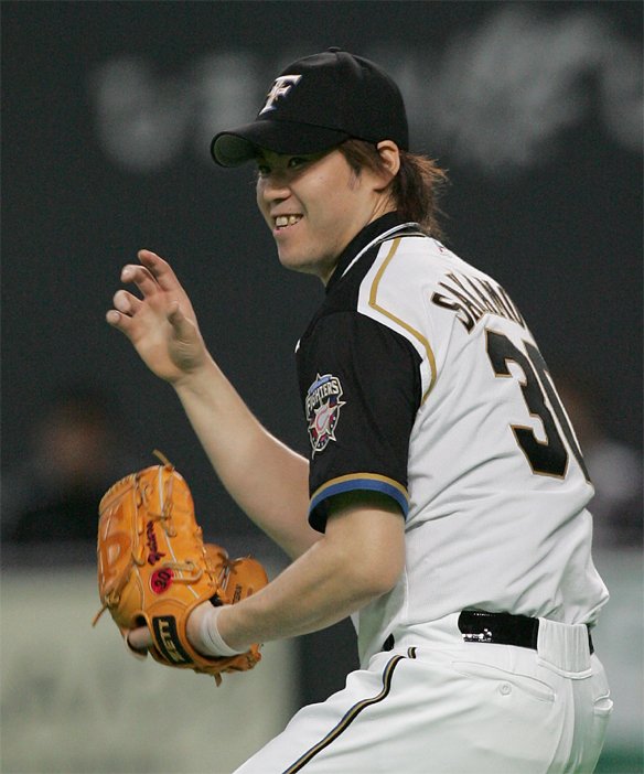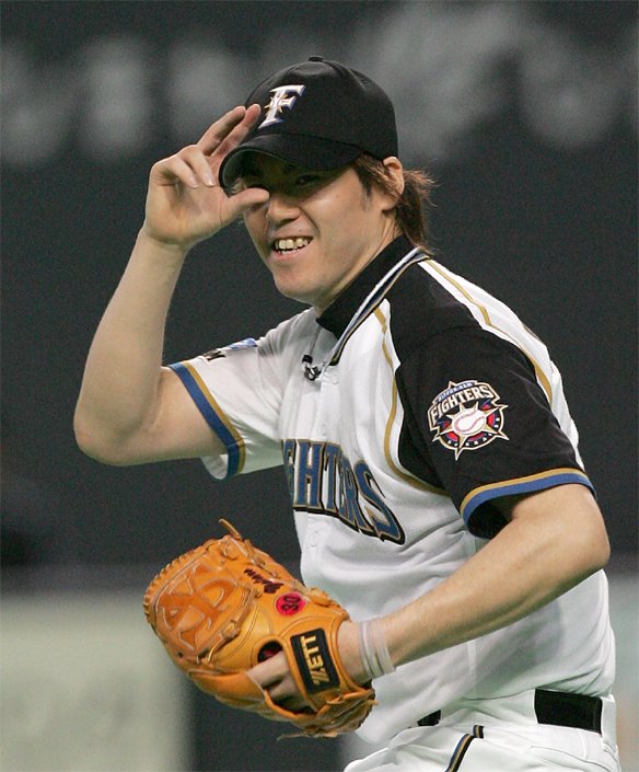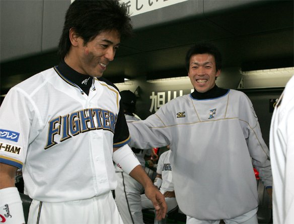 危険球退場したが、勝利に笑顔の多田野投手と稲葉選手