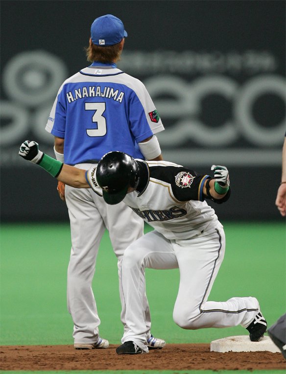 2番 栗山 一ゴ 2塁フォースアウトの間に3塁ランナー細川生還 7-12
