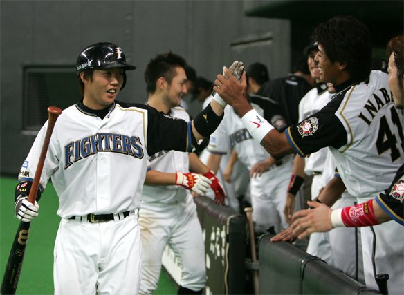 スクイズを決めた鶴岡選手を迎える稲葉選手