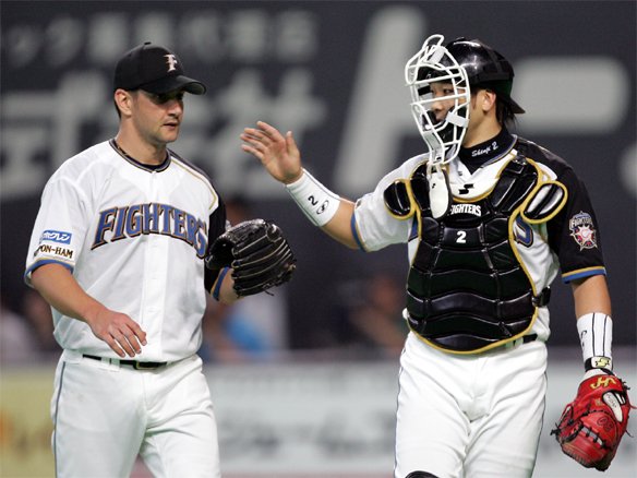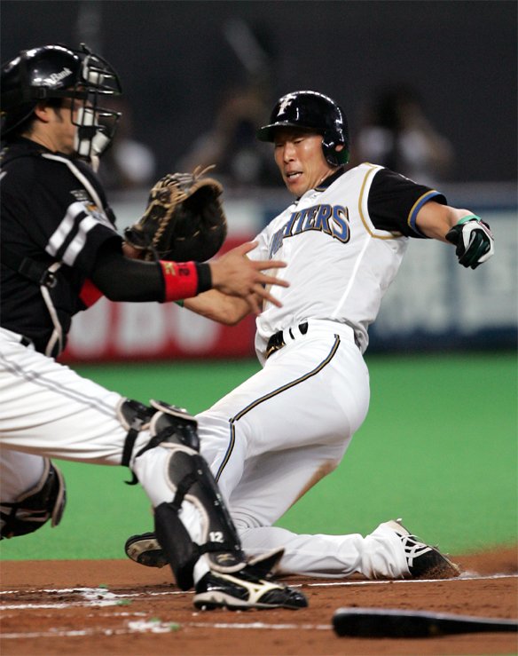 1回、スレッジ選手の安打で森本選手がホームを突くが惜しくもアウト