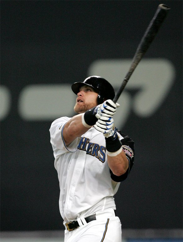 4番 スレッジ 左安 2塁ランナー森本生還 3-3