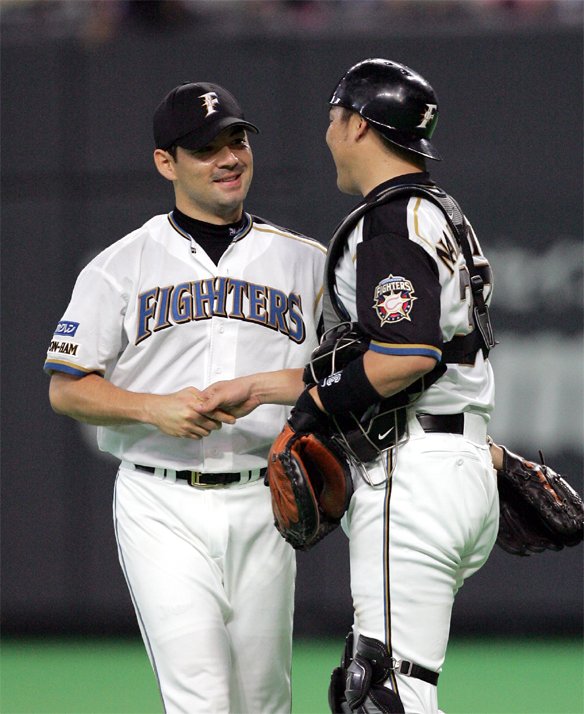 女房役の中嶋捕手と握手するMICHEAL投手