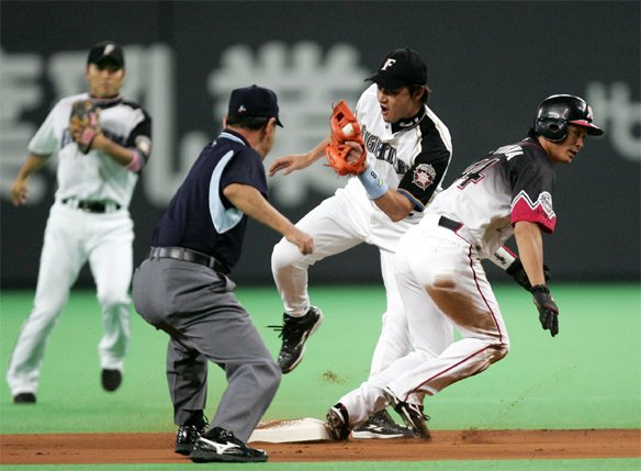 投手 川崎 1番 田中賢 二選 3塁ランナー糸井生還 2-1