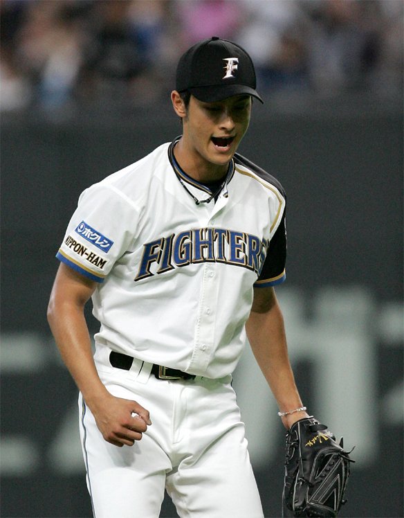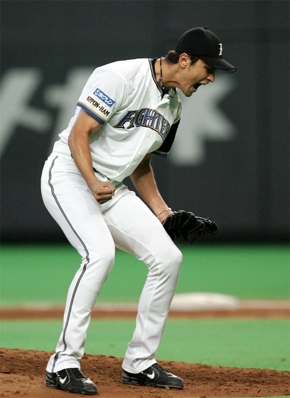 最後の打者を打ち取り、渾身の力を込めて雄たけびをあげるダルビッシュ投手
