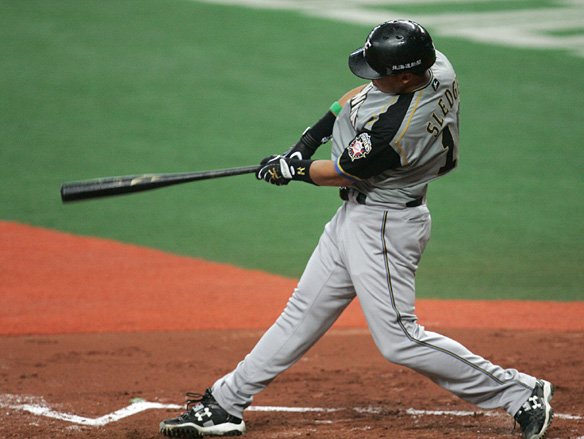 4番 スレッジ 右安 1塁ランナー森本は3塁へ |
