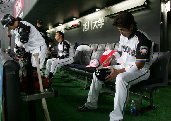 五時間に及ぶロングゲームの敗戦に、ベンチで肩を落す稲葉選手