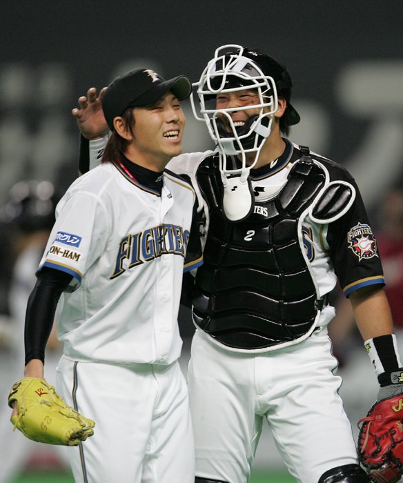 ピンチを凌いだ宮西選手を笑顔で迎える高橋選手