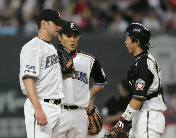 3番 小笠原 空三振 3塁ランナー脇谷、キャッチャーからの牽制タッチアウト |