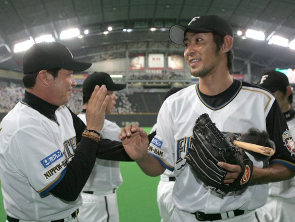梨田監督とタッチする江尻選手