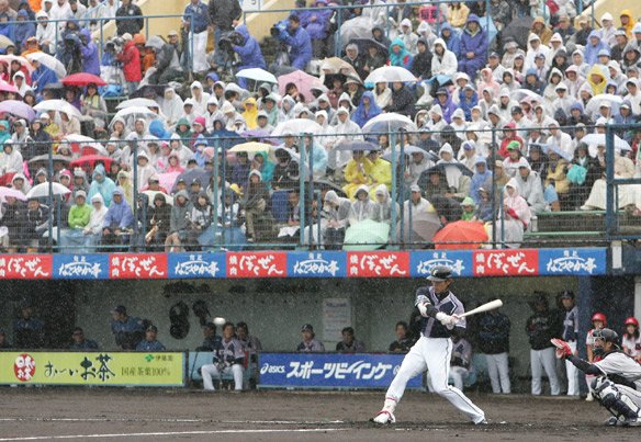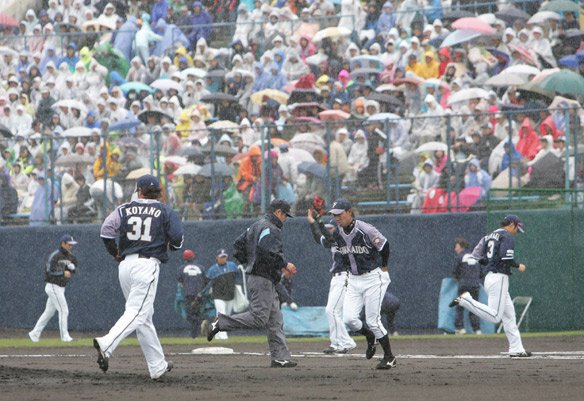 投手 八木 本日(7/18)の試合は1回終了後、雨足が強くなり13時23分から試合が中断していましたが、13時54分に降雨ノーゲームとなりました。 |