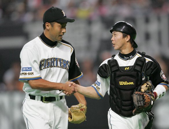 最後のマウンドを三振に打ち取り、鶴岡選手とがっちり握手する伊藤投手