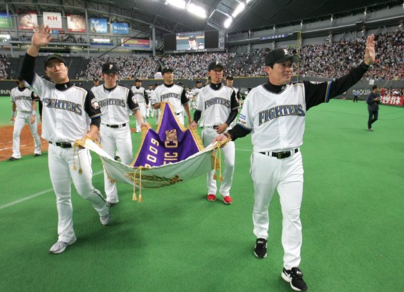 チャンピオンフラッグを持って球場を一周する監督選手たち