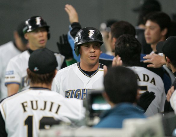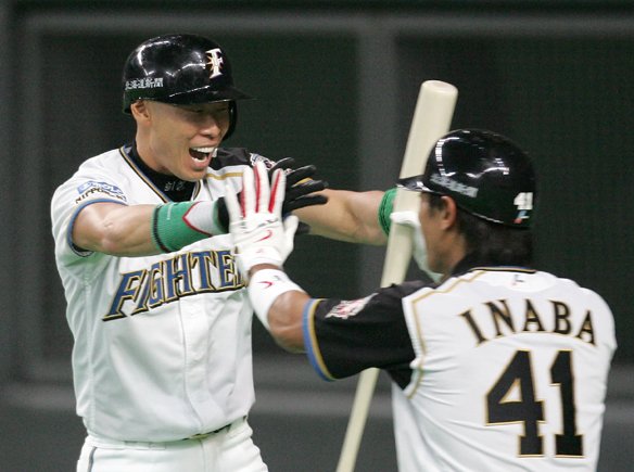 2ランHRを放ち、稲葉選手とタッチ