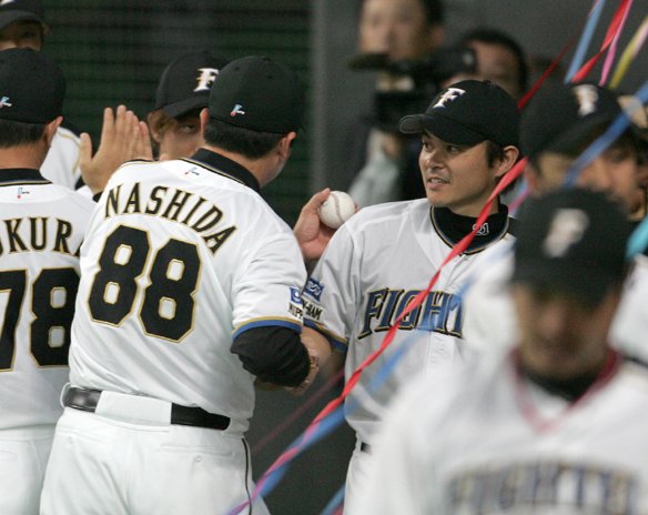 ウイニングボールを監督に渡す武田久投手