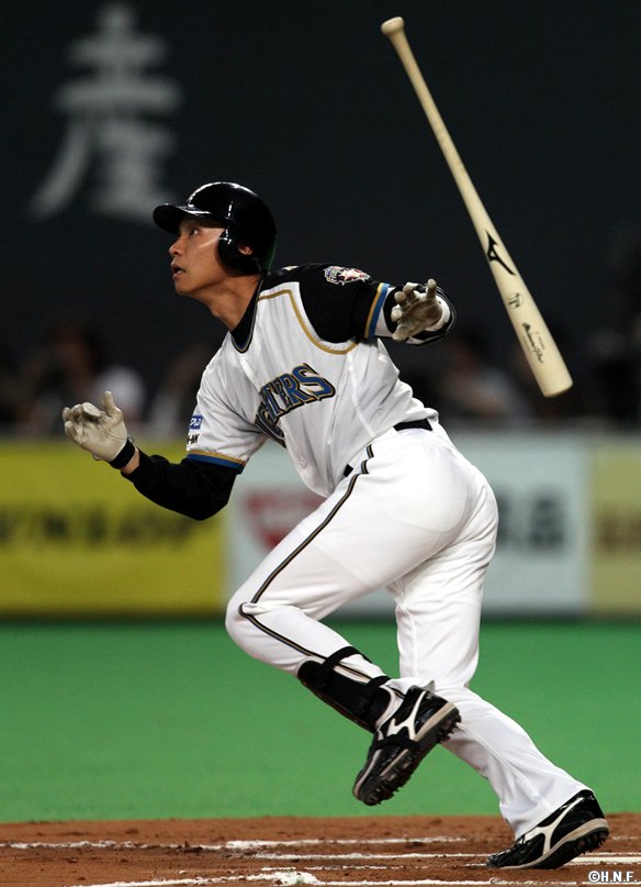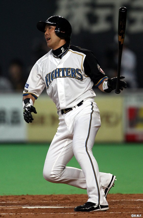 勝ち越しのレフトオーバーツーランホームランを放つ二岡選手