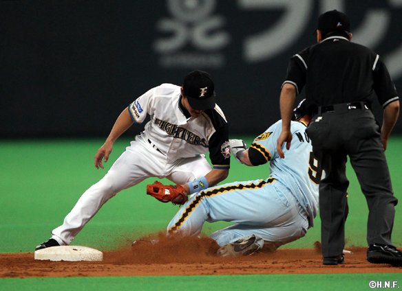 1番 坂 二安 ライナー性の打球をセカンド田中賢がジャンプし、グローブにあてるも捕球できず… ボールが転がる間に2塁ランナーブラゼルがホームを狙うもタッチアウト |