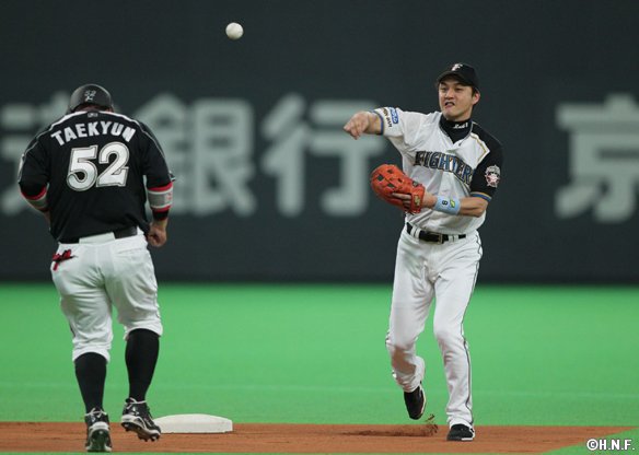 2番 森本 左安 3塁ランナー金子誠、2塁ランナー田中賢生還 7-2 バッターランナー森本、送球間に2塁へ