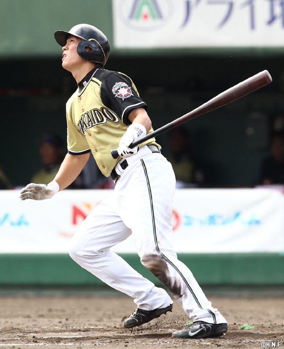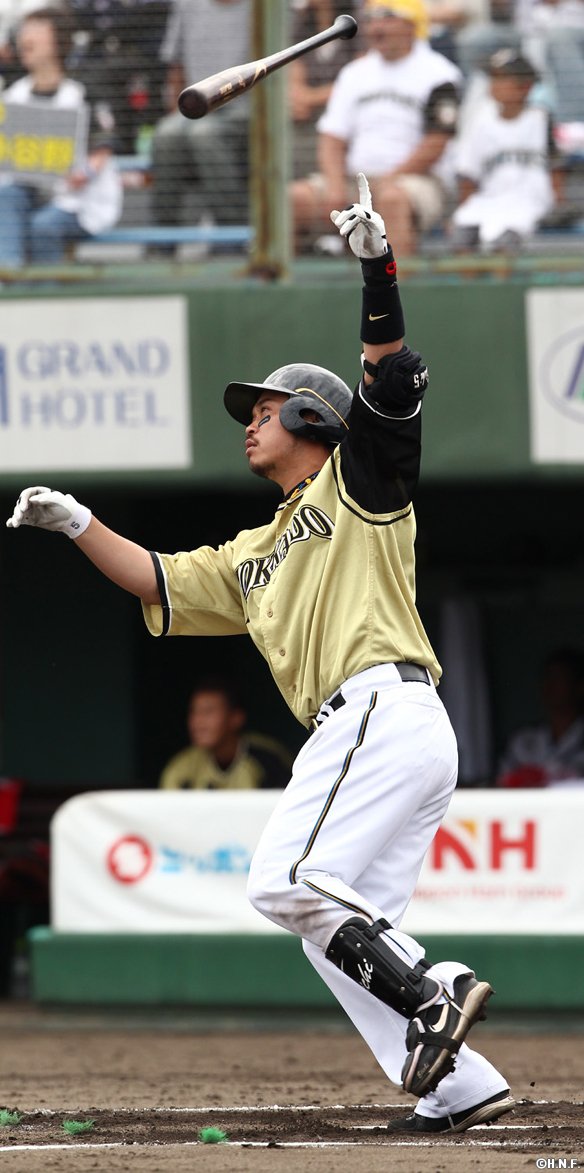 左中間ソロHRを放つ大野選手