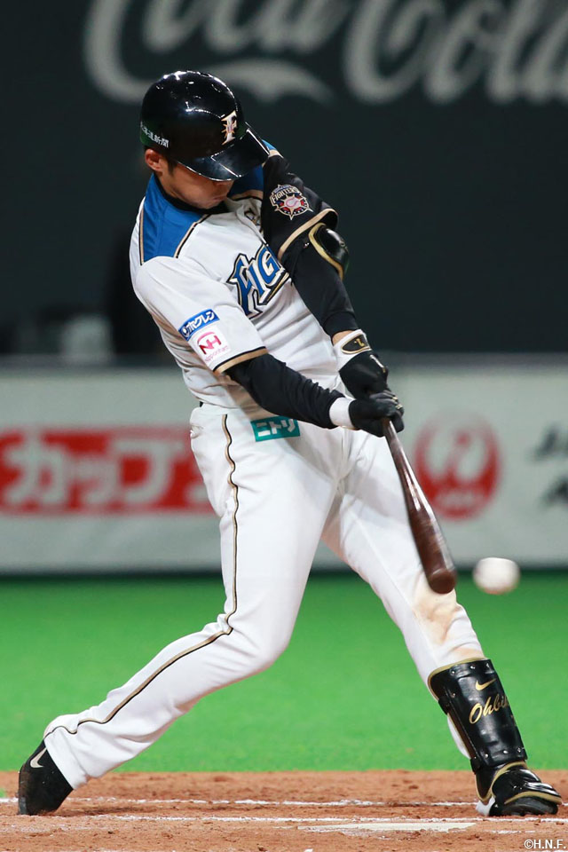 投手 岸 4番 中田 見三振 低めの変化球に見逃し三振 1アウト |