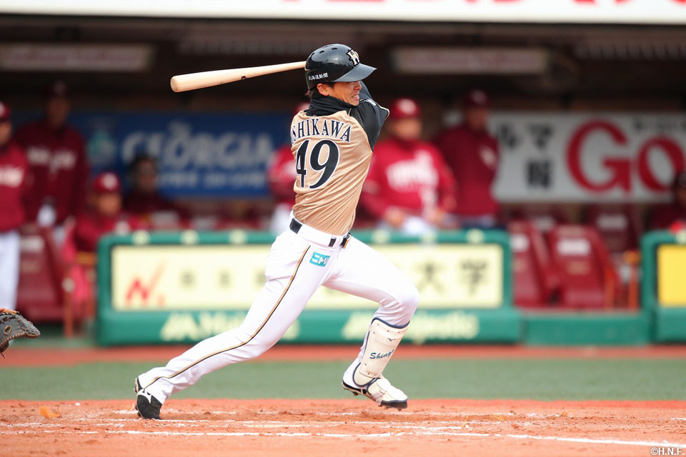 7番 石川慎 中安 1アウト3塁からセンターへのタイムリーヒット 楽0-2日 1塁 ![]() 0