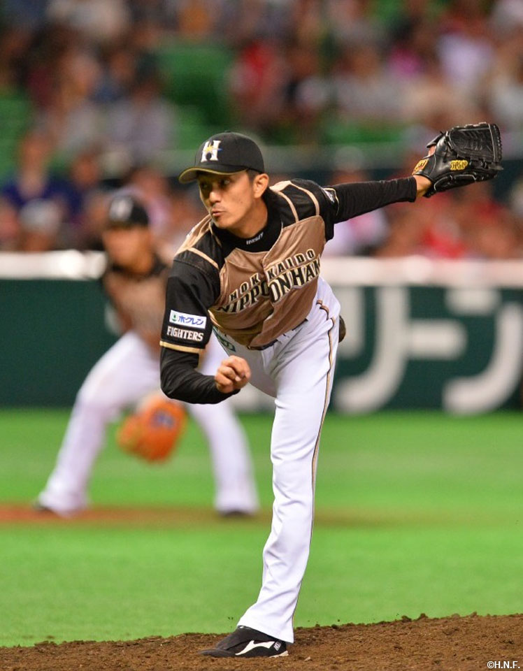 ピッチャー中田に代わってサファテがマウンドにあがる |